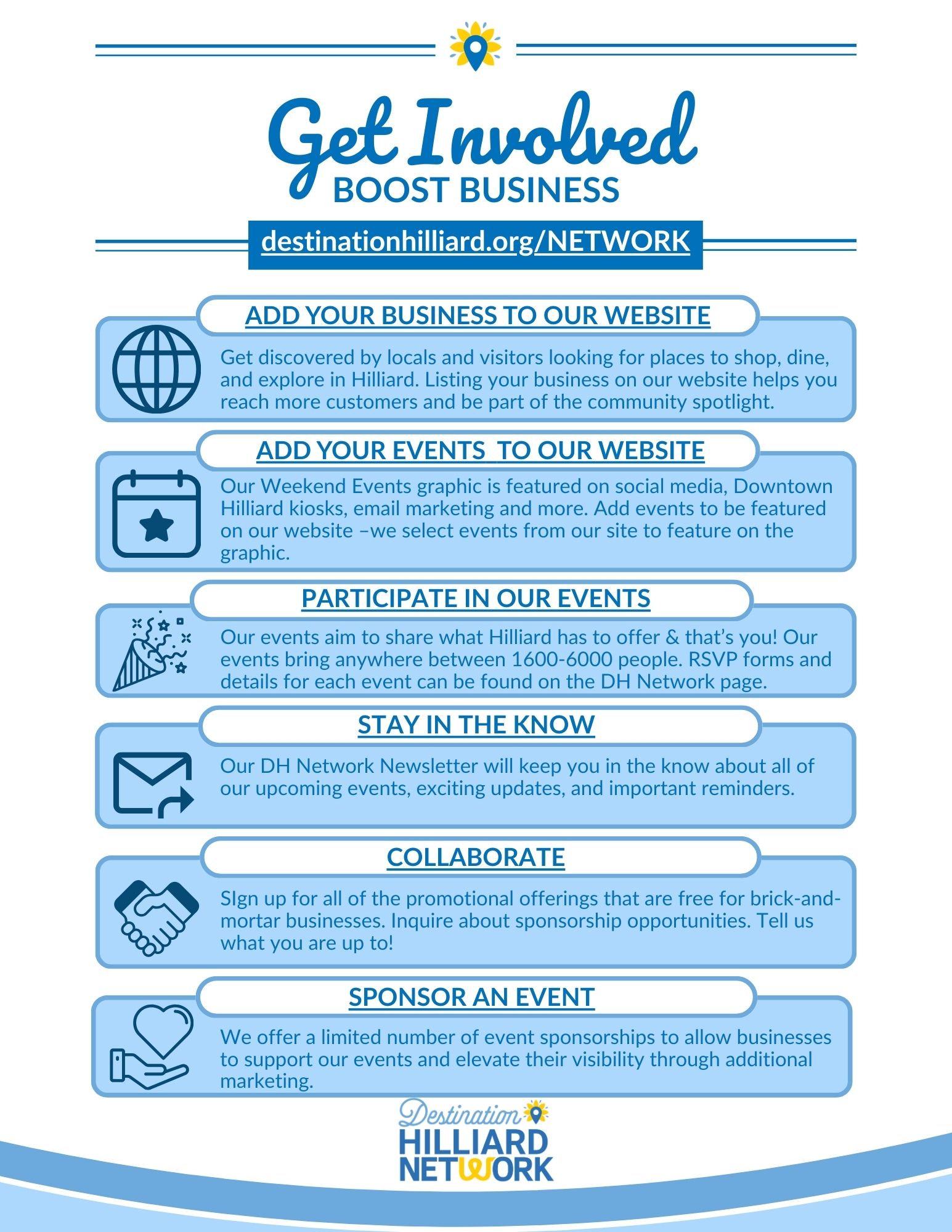 Destination Hilliard’s events draw thousands of attendees and are designed to highlight the best of the community, creating opportunities to collaborate, promote special happenings, and strengthen local connections. Stay informed with Network updates, share what you are working on, and explore sponsorship and promotional opportunities that help amplify your presence and impact in Hilliard.