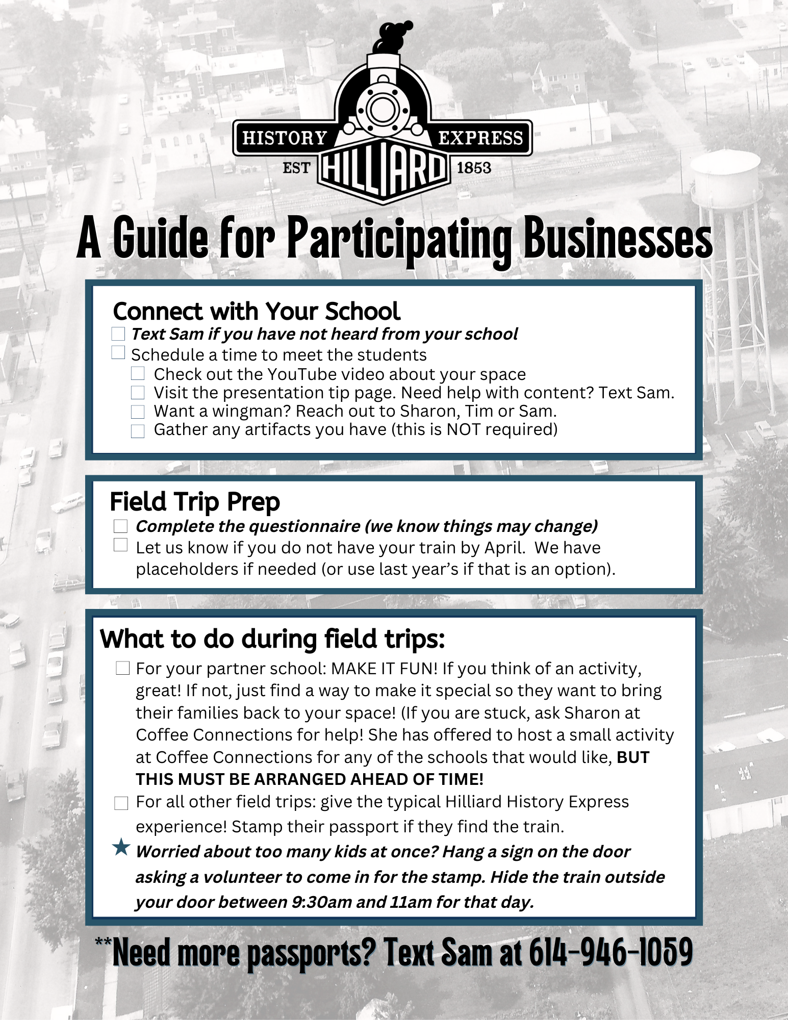 👯 There are three options if you would like to have someone to support you during your class visit. Sharon at Coffee Connections has offered to tag along if you would like. As a former teacher and a Hilliard history enthusiast, she is a great addition. Sam at Destination Hilliard has a background in child development and counseling and has been up to her elbows in Hilliard history for the last few years. Tim from the historical society is the most knowledgeable and may be available to join you. We are working out details with the Hilliard Ohio Historical Society on this piece, as we ran into a little bump in the road.