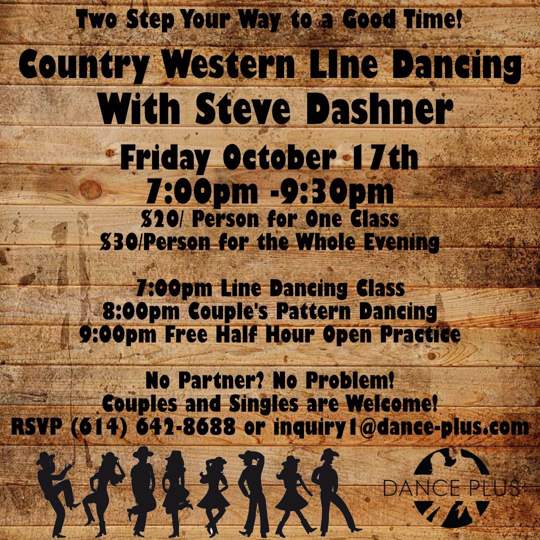 Kick up your heels at the Dance Plus Country and Western Night on Friday, October 17 from 7p-9:30p. Join us for an evening of line dancing and two-stepping. The night includes two lessons - Line Dancing at 7p and Couples Pattern Dancing at 8p, followed by a free half hour open practice. Cost per person is $20 for one class or $30 for both classes. Couples and Singles are Welcome! No partner, no problem. Just show up and dance! RSVP to 614-642-8688 or inquiry1@dance-plus.com