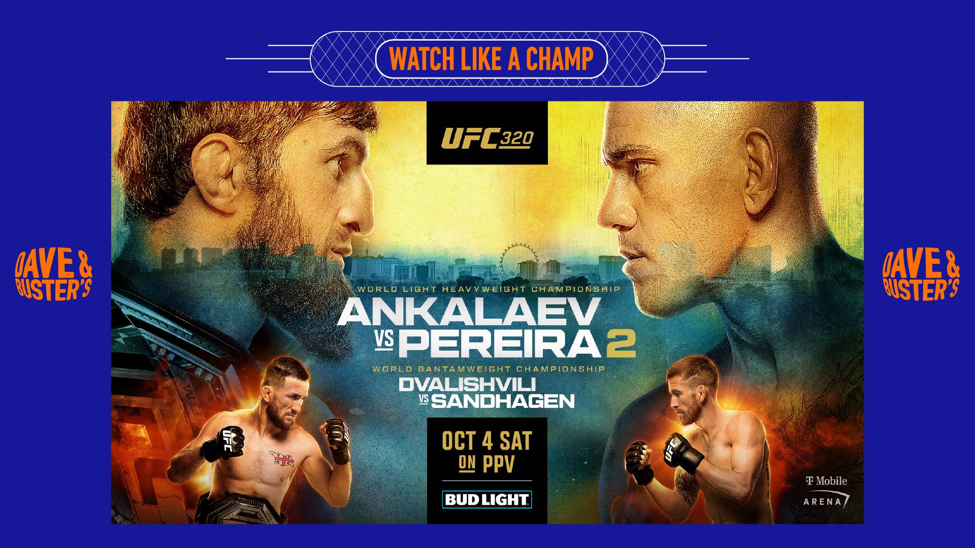 Get ready for an epic Sin City rematch between a defending champion and his redemption-hungry challenger. Catch all the action, excitement, and double leg takedowns of UFC® 320 on October 4, only at Dave and Buster's Hilliard!